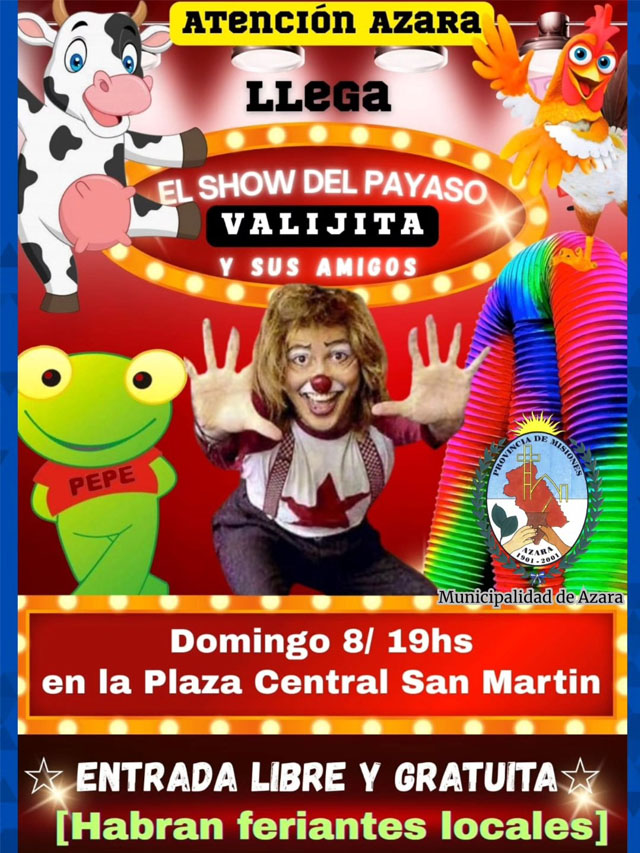 La localidad de Azara recibirá la visita del “Payaso Valijita y sus Amigos”, provenientes de Paraná, Entre Ríos, quienes ofrecerán un show único destinado a los más pequeños y abierto a toda la comunidad. La función está programada para el domingo 8 de febrero a las 18:30 horas en la plaza central San Martín.